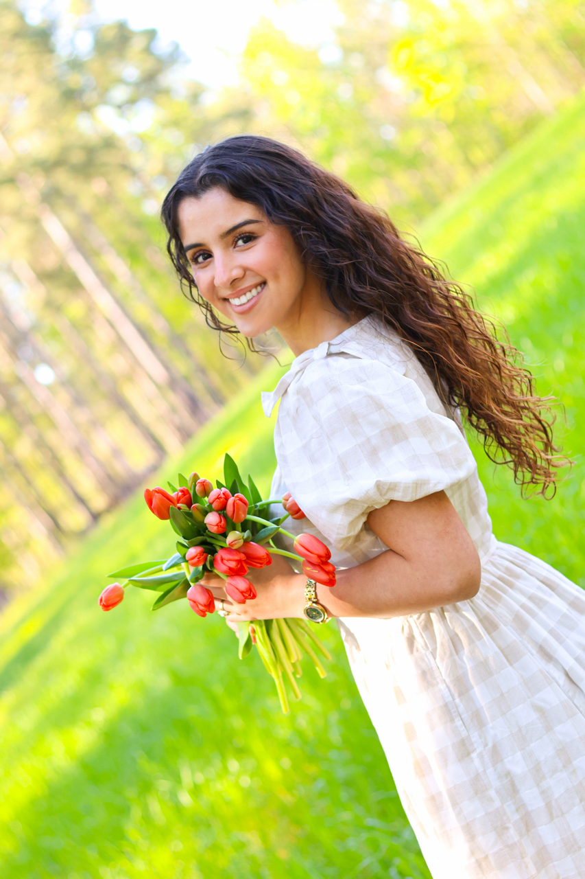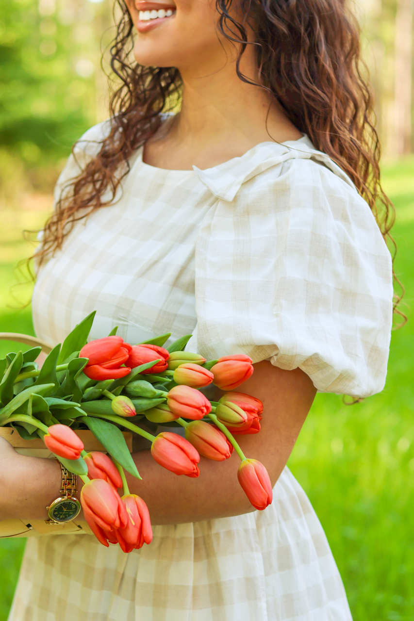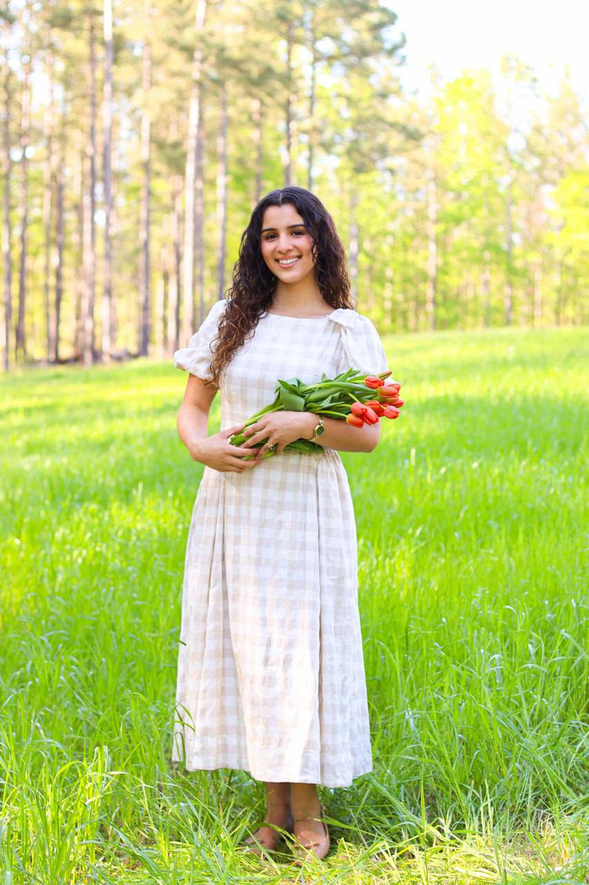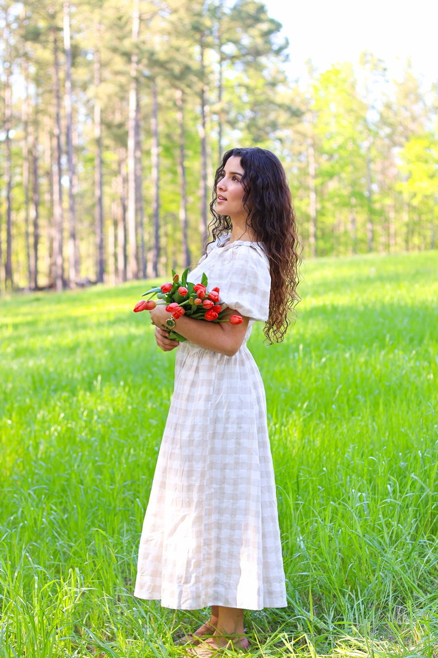 A soft, neutral gingham dress with puff sleeves and a relaxed fit. Effortless, airy, and perfect for everyday elegance