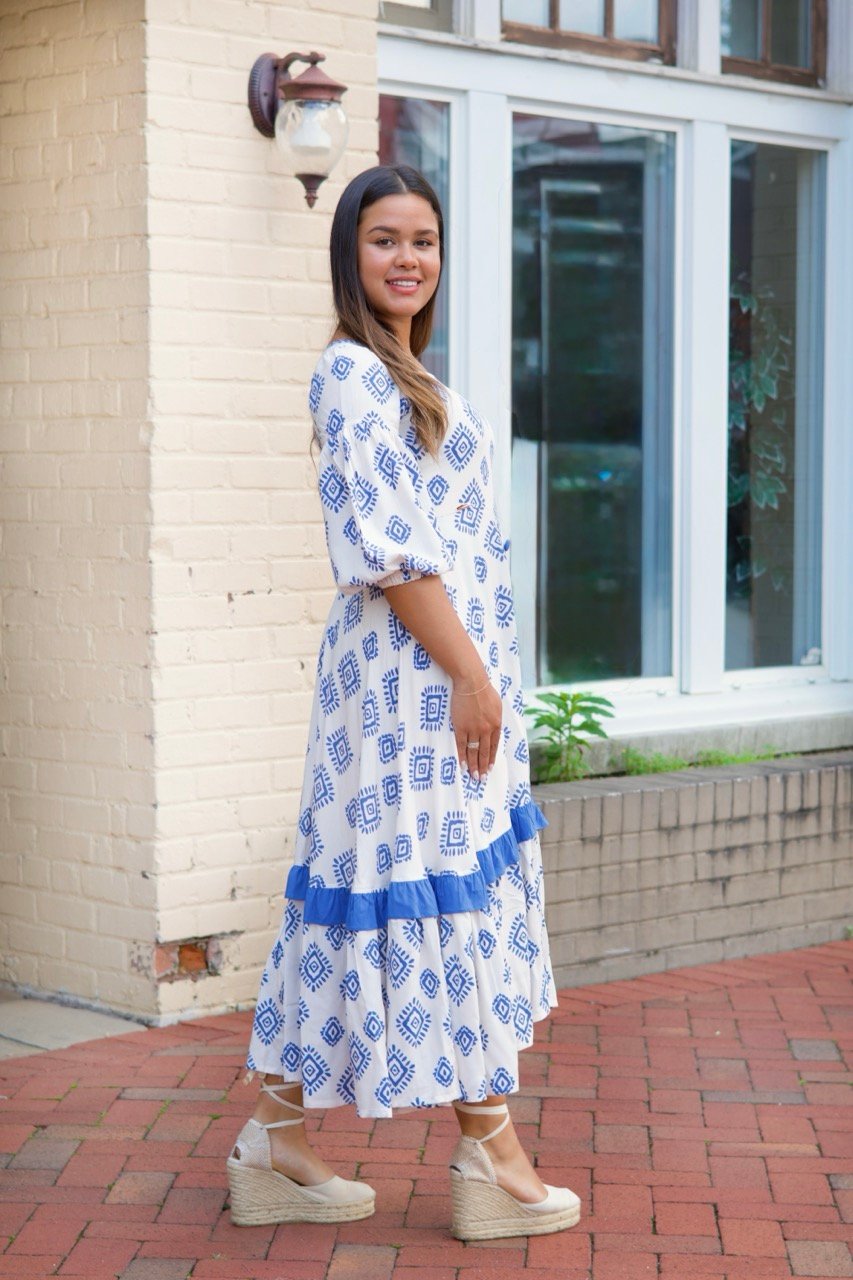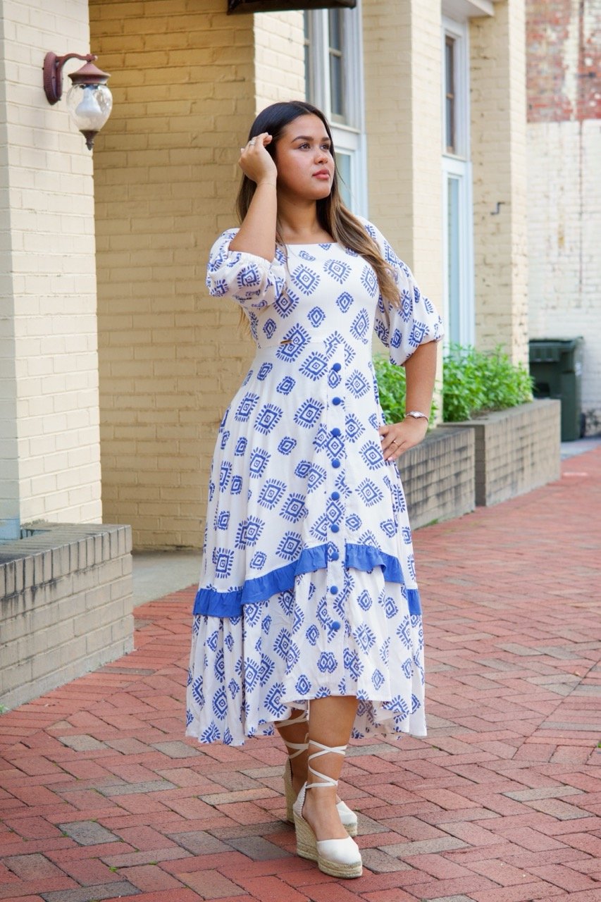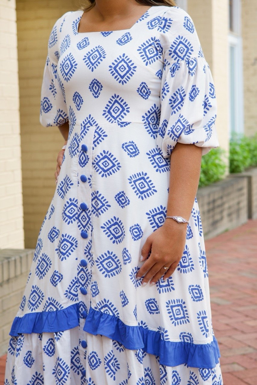 White – blue Midi dress with vibrant blue geometric prints, button-down front, and ruffle trim for a fresh, breezy look