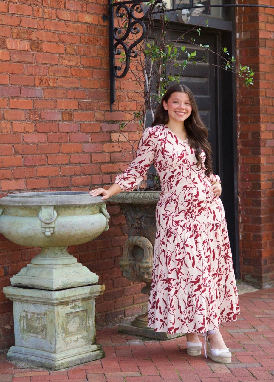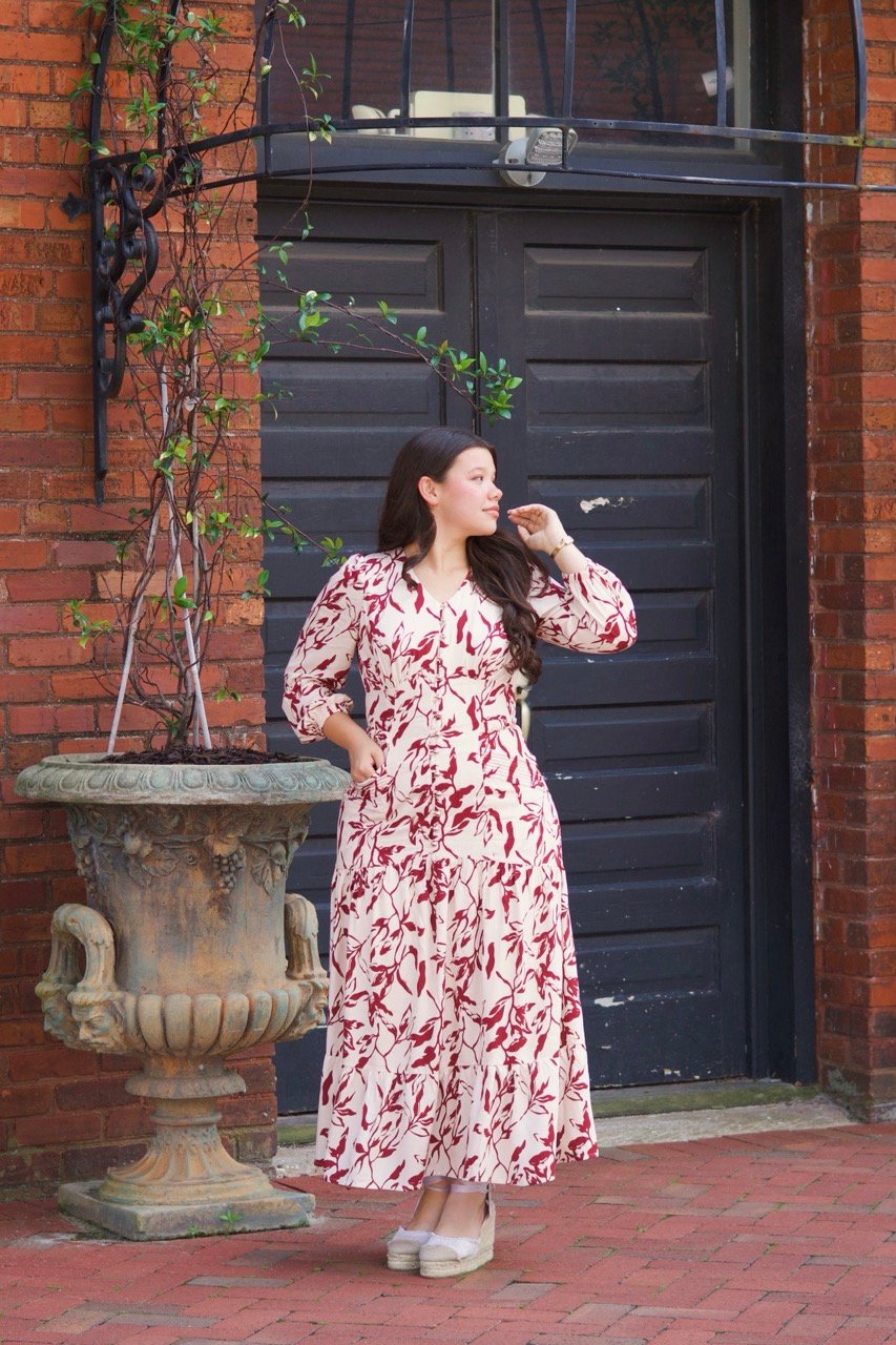 This cream maxi dress is the perfect blend of sophistication and practicality. Decorated with bold red floral prints, it features a flattering V-neckline, long sleeves, and a gracefully tiered skirt that moves beautifully. Golden button details at the front add a refined touch, while discreet side pockets bring everyday comfort and functionality. Romantic yet versatile, this dress is ideal for garden parties, special gatherings, or simply enjoying a stylish day out.