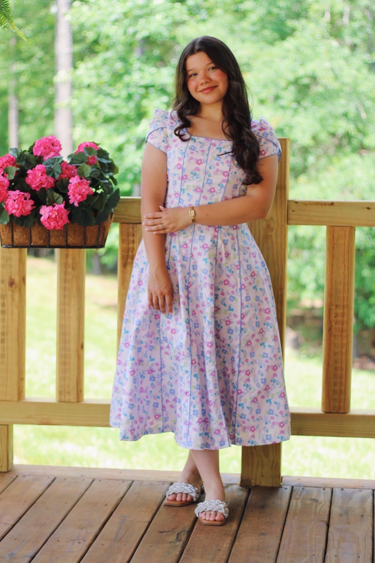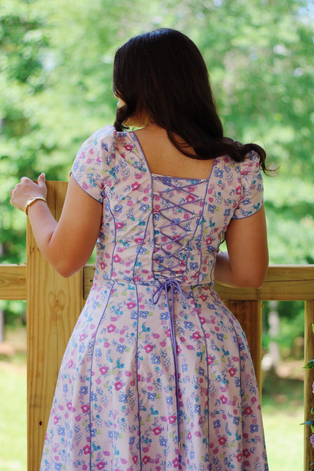This floral print midi dress is crafted from lightweight poplin, designed in cut panels and finished with sculpted bias trim for subtle structure. Its corset-style back creates a defined, flattering fit, while the voluminous puff sleeves add a romantic touch. The flowing full skirt completes the look, offering both elegance and ease—perfect for garden parties, daytime events, or any occasion that calls for effortless charm.