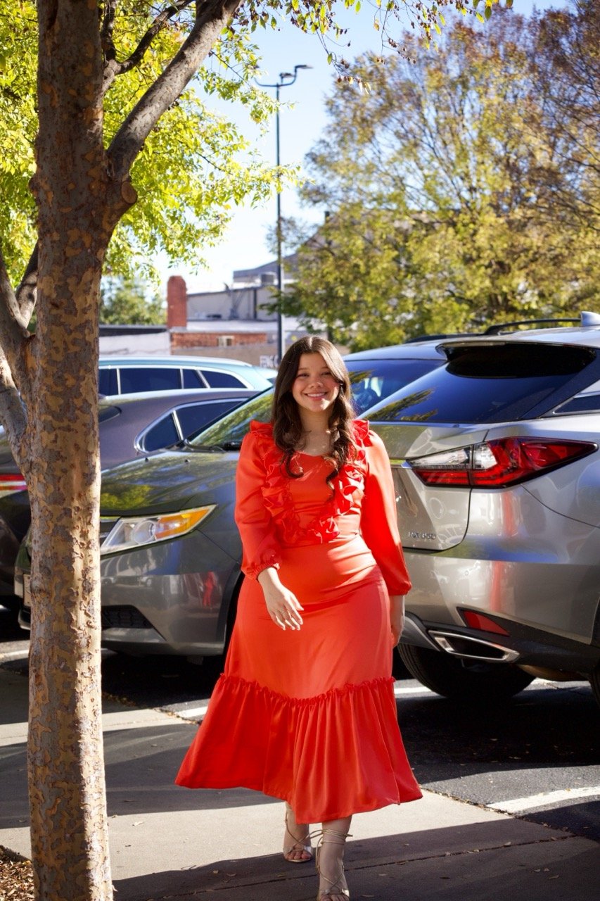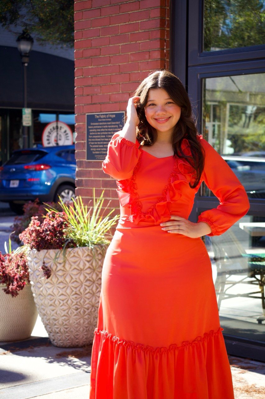 Bring brightness to your day with this stunning orange midi dress, featuring romantic ruffle details along the neckline and hem. Its flowy silhouette and long sleeves create the perfect balance between fun and sophistication. Ideal for brunch, special gatherings, or Sunday mornings, this dress adds a joyful and confident touch to any occasion. Pair it with heels or sandals for an effortlessly chic look.