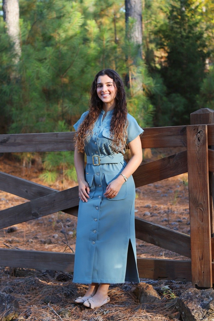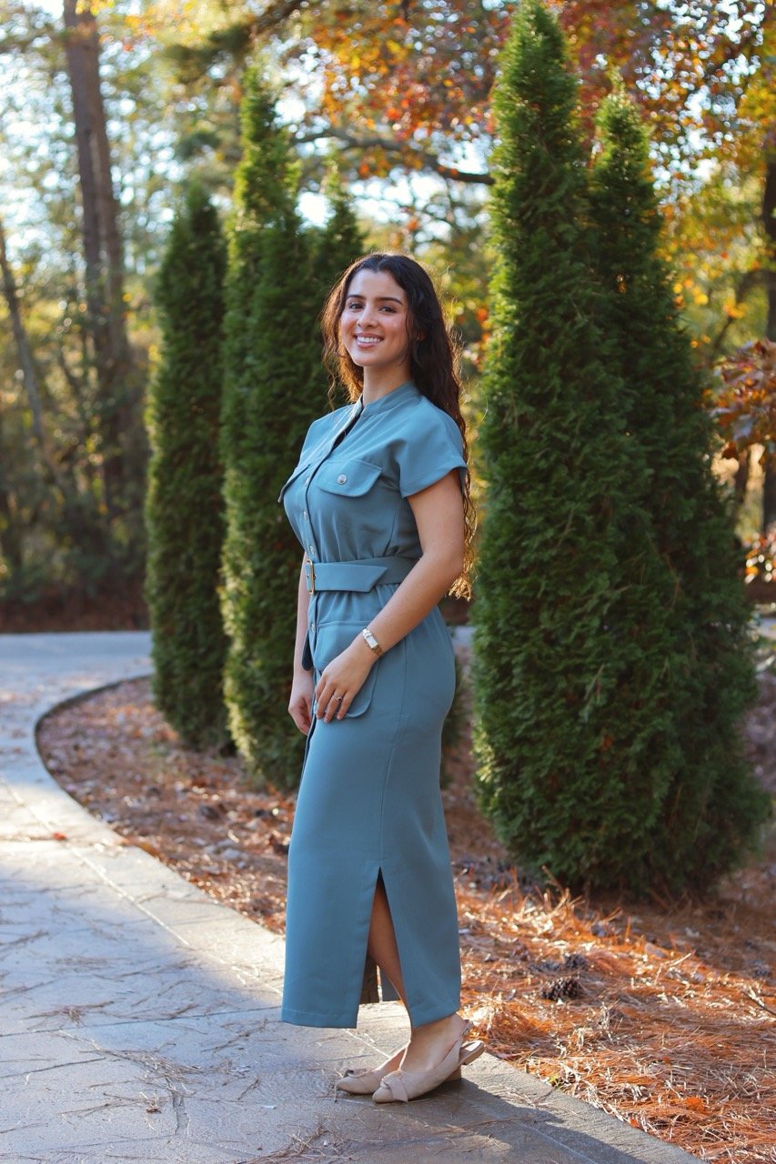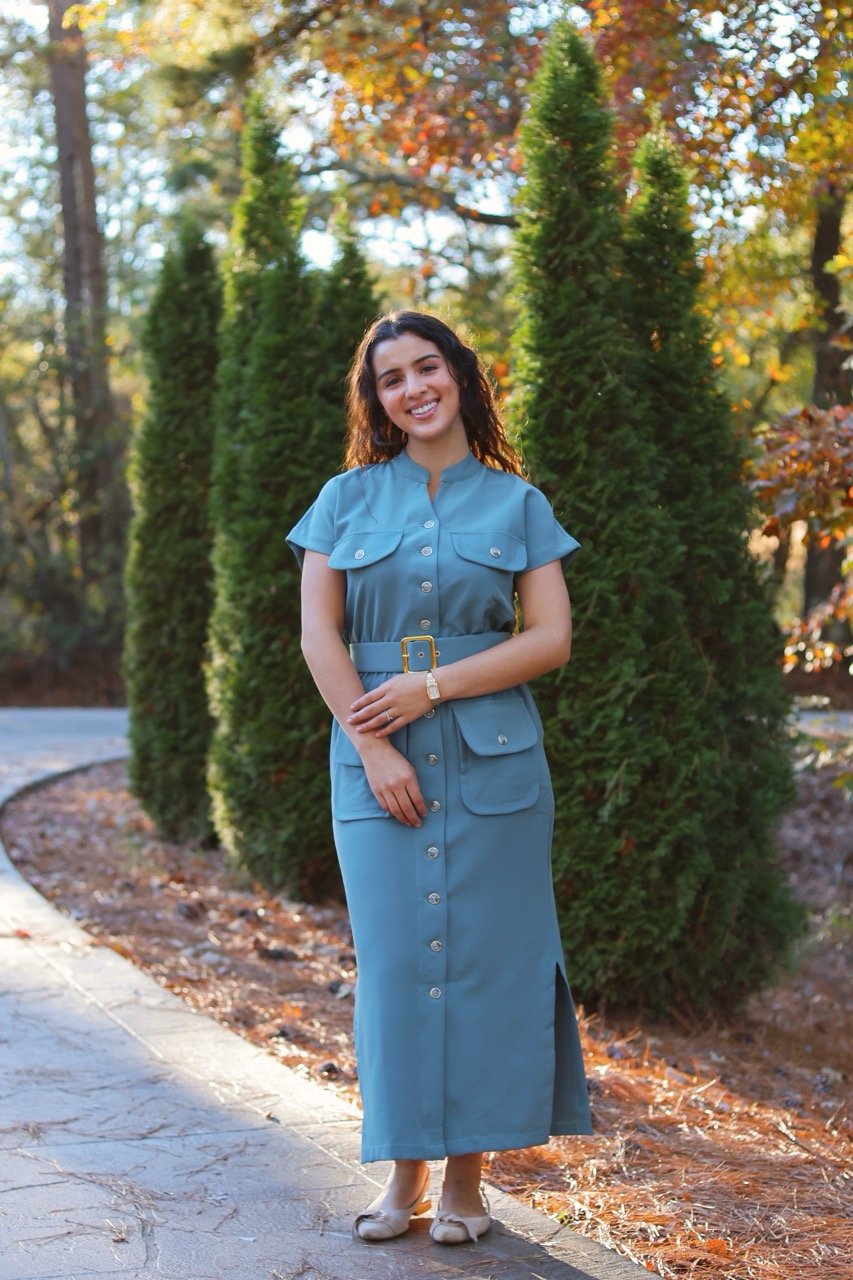 Designed with timeless elegance in mind, this dress features a structured silhouette with a waist-defining belt and front button details. The large pockets add a touch of modern utility, while its soft blue tone brings sophistication to any occasion — perfect for both daytime outings and evening moments.