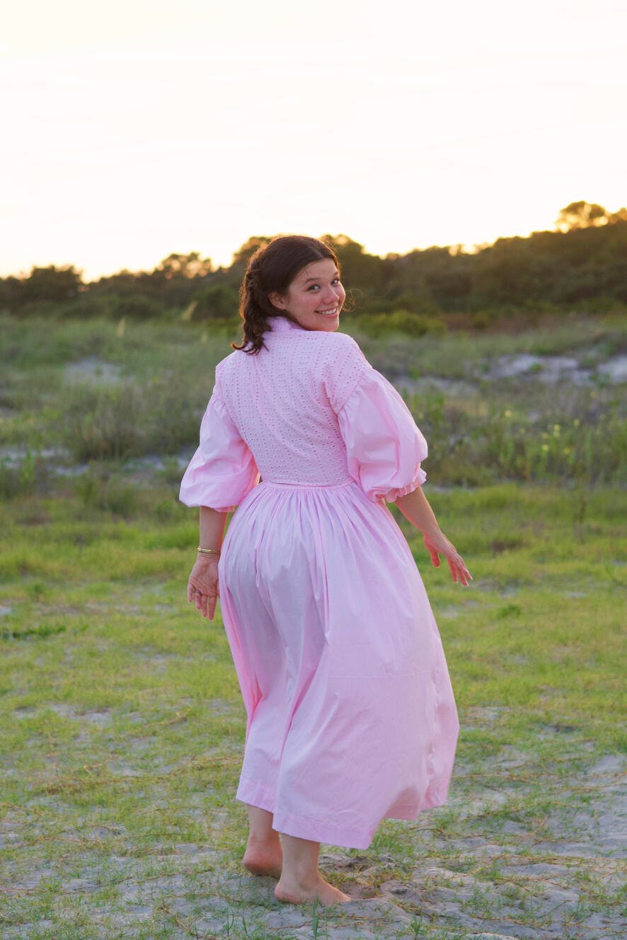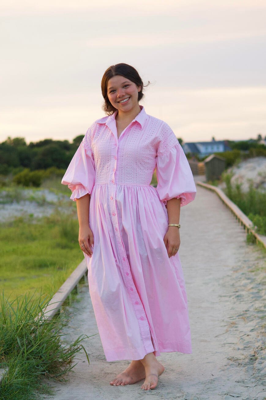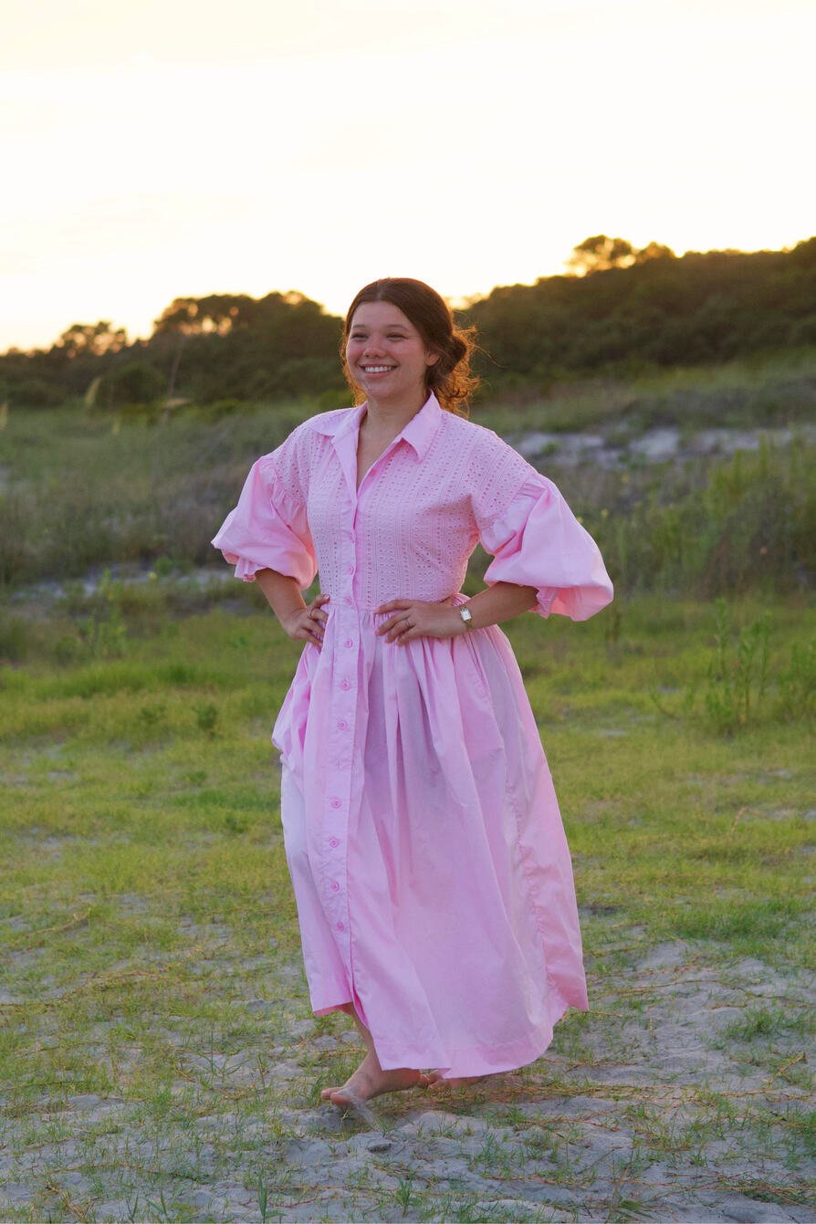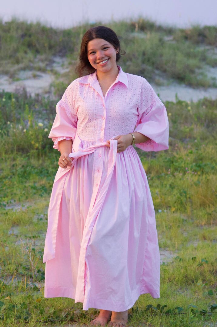This pink maxi shirt dress combines delicate details with relaxed elegance. The upper bodice is crafted from soft eyelet fabric, while the rest of the dress features 100% cotton poplin for a crisp, comfortable feel. Designed with a classic shirt collar, functional front buttons, and oversized-cut sleeves, it offers a modern, effortless silhouette. The voluminous skirt flows gracefully, and practical side pockets plus a matching belt allow for a customizable fit. Perfect for casual outings or chic everyday style.