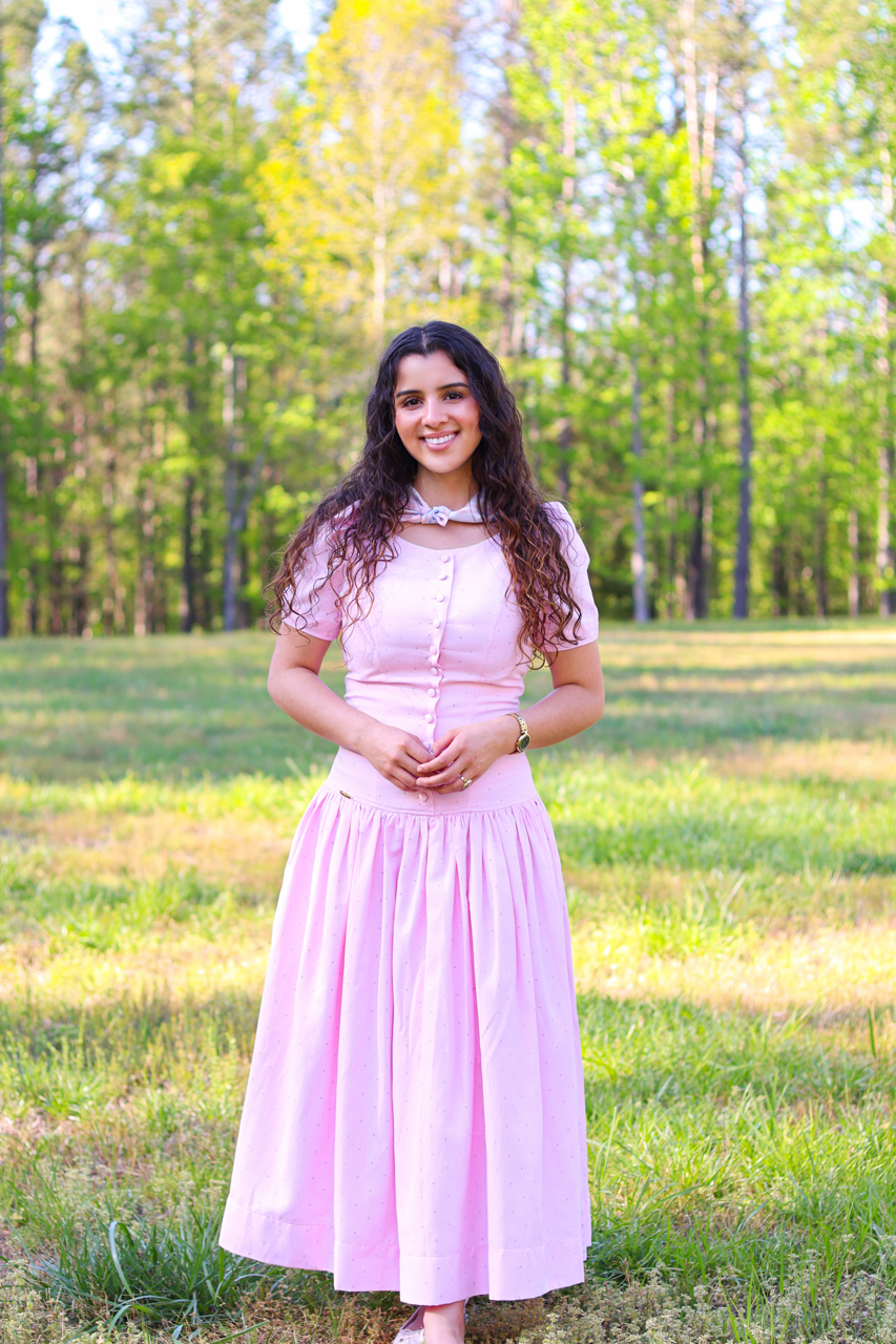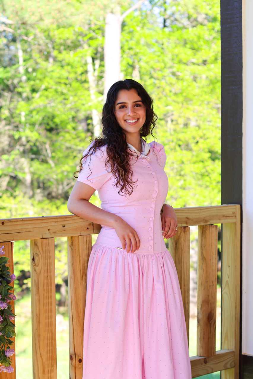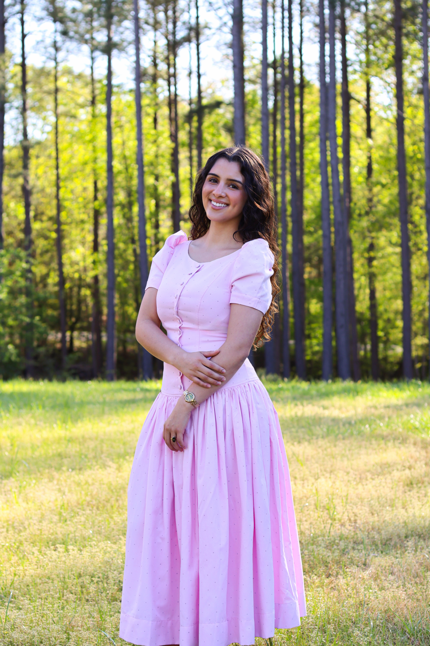 This elegant pink dress features a fitted bodice with delicate detailing and soft puff sleeves for a timeless, feminine look. The flowing midi skirt adds movement and comfort, creating a flattering silhouette. Made from lightweight fabric, it’s perfect for warm days, special gatherings, or dressing up with ease.