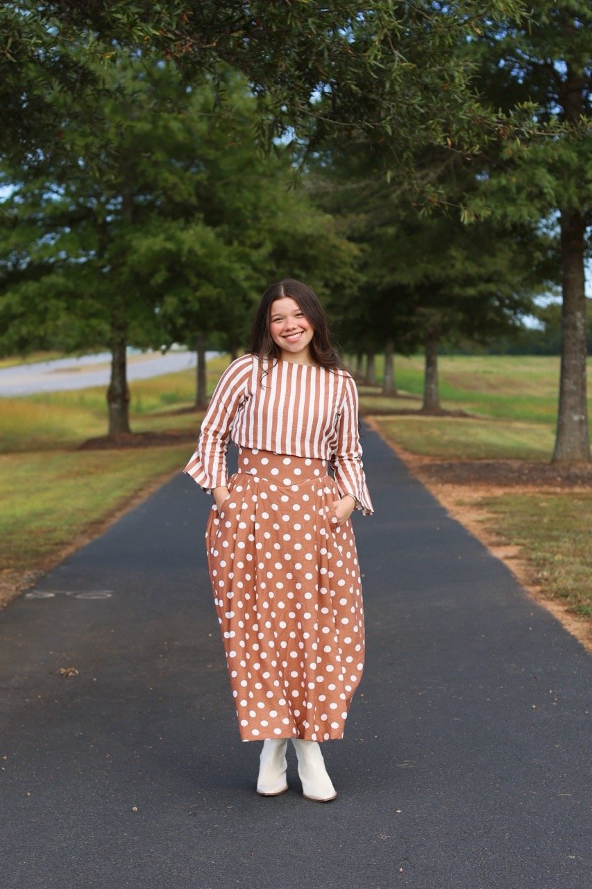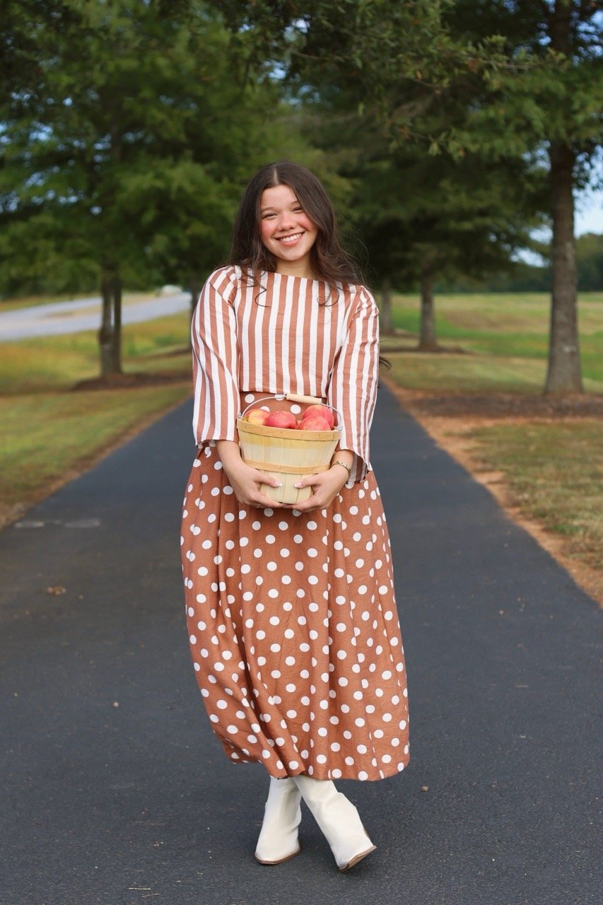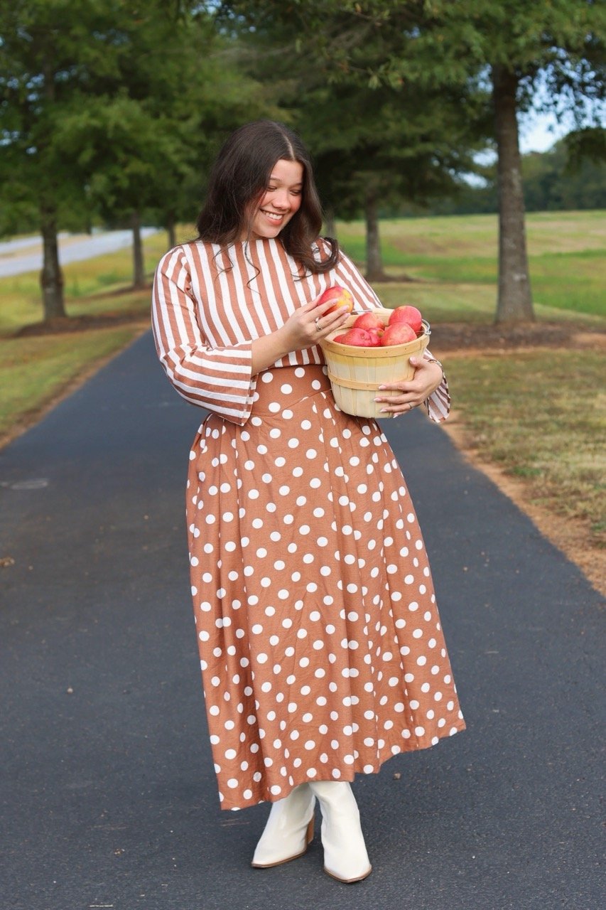 This beautiful two-piece set blends playful charm with timeless elegance. The top showcases classic vertical stripes, while the high-waisted skirt features a lovely polka-dot pattern — both in rich caramel tones that capture the essence of fall. Crafted with comfort and style in mind, this outfit is perfect for brunch dates, Sunday gatherings, or any moment you want to feel effortlessly feminine and graceful. Pair it with your favorite boots for a complete autumn look.