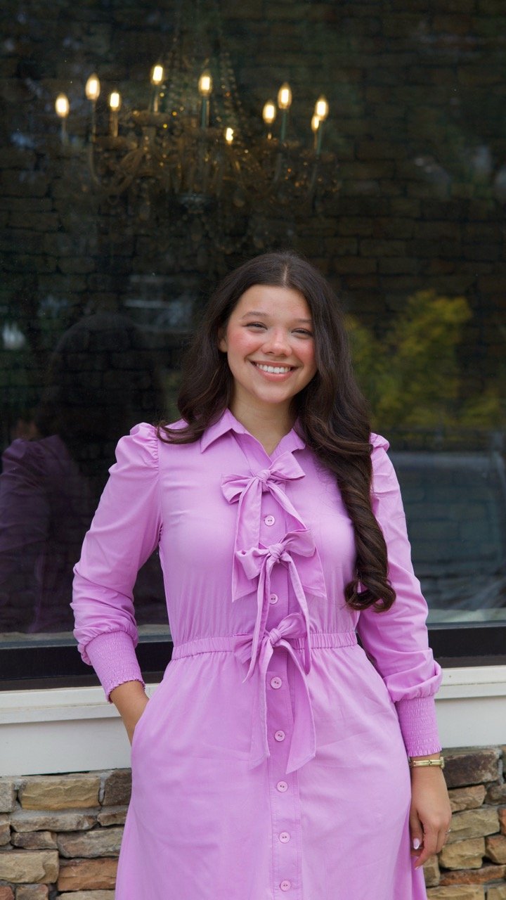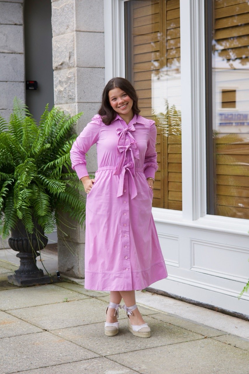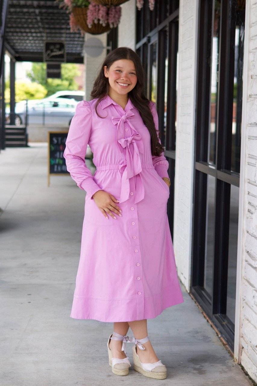 This pastel pink midi shirt dress blends classic charm with feminine elegance. It features a graceful bow-tie neckline, long sleeves with gathered cuffs, and a full button-down front for timeless appeal. The cinched waist creates a flattering silhouette, while the flowing skirt adds movement and ease. Perfect for both casual outings and polished daytime occasions, this dress offers effortless style with a touch of romance.