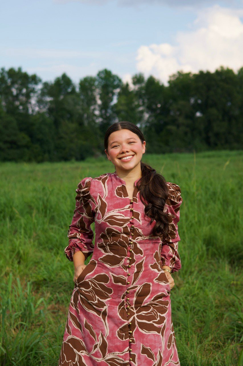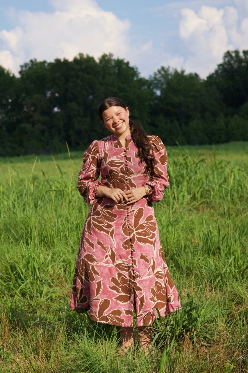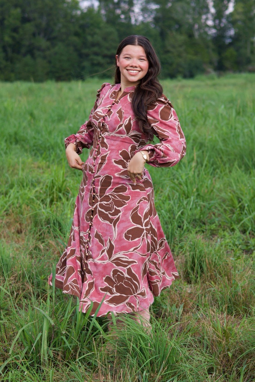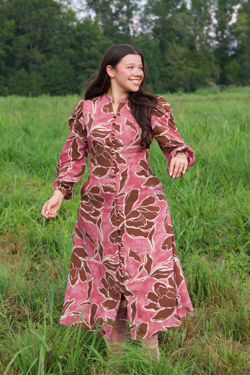 This linen dress blends natural charm with timeless style. Soft and breathable, it’s perfect for all day wear. The earthy floral print, button down front, and puffed sleeves create a feminine, versatile look – ideal for both causal outings and special occasions.