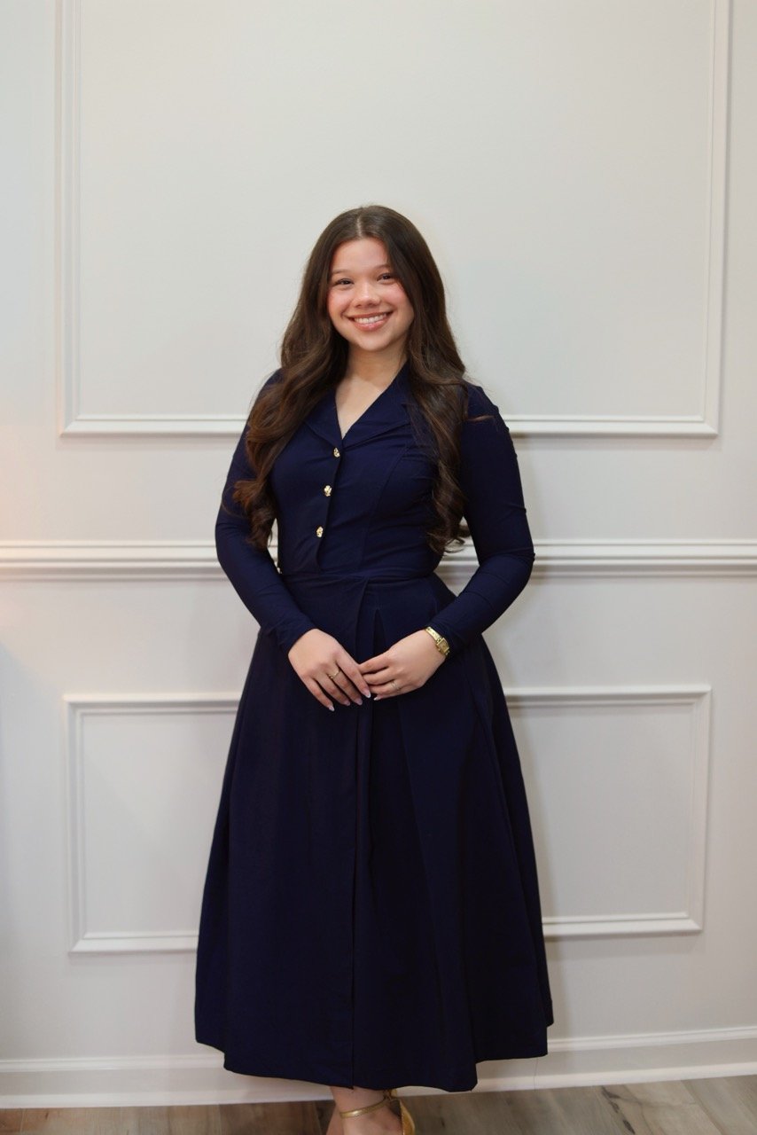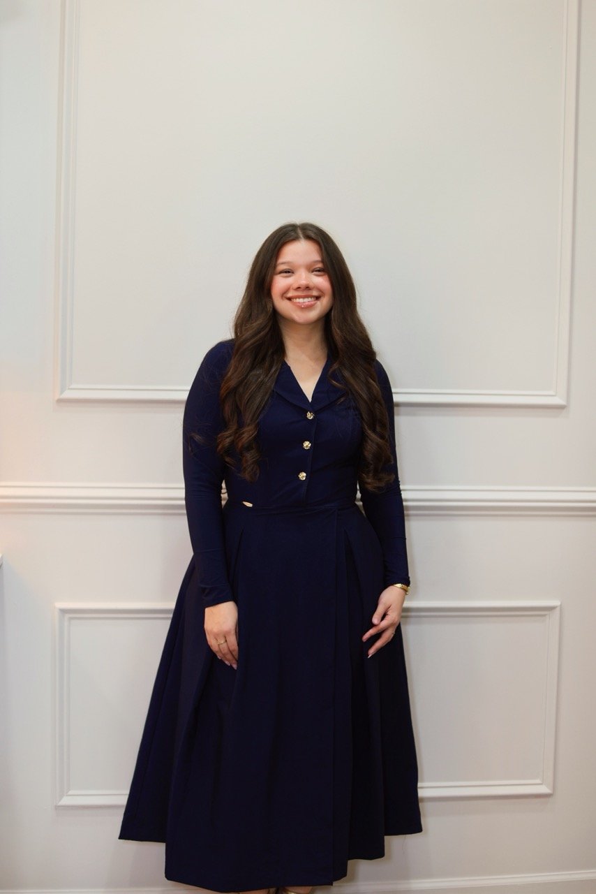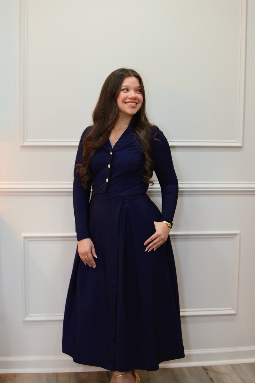 This deep-blue dress features a fitted bodice, long sleeves, and a pleated skirt that moves gracefully. Gold-tone buttons add a festive touch, making it perfect for holiday gatherings, church events, or special occasions. Elegant, comfortable, and timeless.